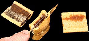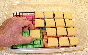 This is a photo of my fig newton re-hydrator. It's a large, shallow plastic container with moistened sponges on the bottom and a rack over them to keep the cookies from touching them. (A layer of damp paper toweling also works well.) Once covered, water evaporating from the sponges quickly raises the humidity to 100-percent. This slowly and gently moisturizes the cake part of the fig newton making them as moist and succulent as desired. How long you leave them in the re-hydrator depends on how moist you prefer your fig newtons. I find 24 hours is perfect, longer and they get a little soggy, shorter and they may still be a little crumbly. The time also depends on how moist the fig newtons were initially. Drier newtons may take and extra couple of hours.