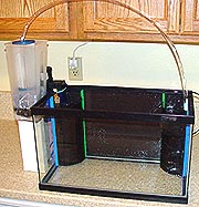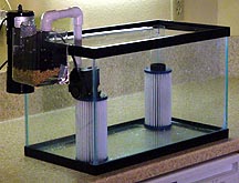 NEWER!!! Filter update! As nice as the Micro Killer 2000 was, it had several problems. There was a lot of hardware in the tank, which gave too many places for fry to hide and a lot of surface area for algae to grow. Also, it was difficult to clean everything without disturbing the fry. Siphoning the bottom of the tank was almost impossible. The outside canister was very limited as to how much carbon it could hold. But, the biggest problem was that the intake filter cartridge capture debris on the outside surface; when the cartridge was taken out of the tank for cleaning much of that debris fell off back into the tank. The solution to all these shortcomings?... the Microbe Killer 3000!