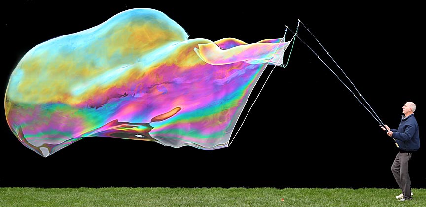 Few objects have the power to stop people in their tracks and stare in astonishment as much as the sight of a huge soap bubble floating by on a breeze. Seemingly impossible to exist, they twist and undulate in fantastic shapes, reflecting rainbows off their shimmering surfaces. Children laugh and run along side of them, parents point and watch mesmerized and even the most cynical can't resist the tickle of a smile. This page shows giant soap bubbles in their full glory in photos and videos and explains how anyone can create these beautiful miracles of soap and light.