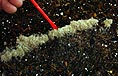 Lifting the glass plate exposes the worms in a dense clean line 1/4 to 1/2 inch thick and wide. I'm scooping them up here with a plastic paddle but have learned that a tweezers used with a gentle touch works better. This technique produces worms that are easier to collect than scrapping them off the bottom of the glass plate and they are much cleaner.