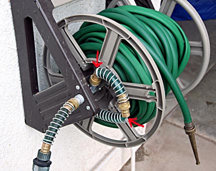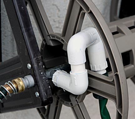 These kinks not only weaken the hose, they create noisy whistling sounds and reduce the flow through the hose. All this is caused by manufacturers failing to mount the connection inside the reel and tangent to it. My solution was to use a female PVC connector, three 90-degree elbows and a male connector to create a rigid connector that carries the water to the inside of the reel, where it can attach to the hose without kinking.