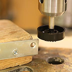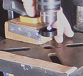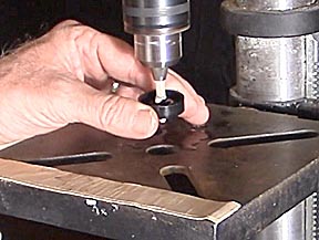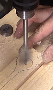 Using clamps and a one inch paddle bit, drill the hole for the tungsten disk. Forstner bits cut smoother, but cost ten times as much. The center for the hole is one inch in front of the rear axles. This hole is cut before cutting out the body so that the piece of wood is strong enough to withstand vibrations from the paddle bit.
