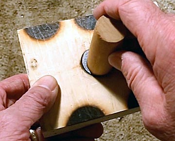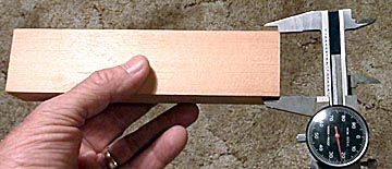 Another problem with blocks is that they are often cut with a taper. Measure the width at both ends. If one is smaller than the other then the block actually has a wedge shape. Drilling axle holes in such a block results in the wheels on one side pointing slightly toward the wheels on the other side. Like a skier snow plowing down the side of a hill, the car may run straight but the wheels will be pushing against each other and thereby slow the car. If your block has a taper, use tape on each side of the narrow end to widen it to equal the other end. Then when the block is placed on the drilling jig the axle holes will be drilled parallel to each other.