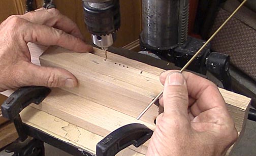 I used a jig on a drill press to make sure the bit drills perpendicular to the sides of the block. Several test holes are drilled in a practice block and checked with a very straight brass rod to make sure they are correct. A good right angle plastic is used to check the angle between the side of the block and the rod while a straight edge is used to check the angle between the bottom of the block and the rod. Getting the drill press and jig aligned can take some time, but the results are well worth it.