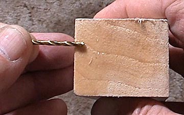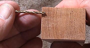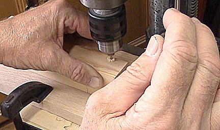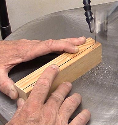 Once the jig is aligned, proceed to drill the axle holes. Drill slowly so that any angled grain lines have less of a chance to deflect the bit. It usually takes me 30 seconds to drill a single hole. I prefer drilling the holes, which are 3/4 inch from each end, before cutting the block so there is as much wood as possible to push against the jig. Placing the wheels as far apart as possible increases the lever arm effect as the rub against the guide rail so that they don't rub as hard as short wheel base cars. Be sure your pack's rules allow for extended wheel bases before drilling axle holes.