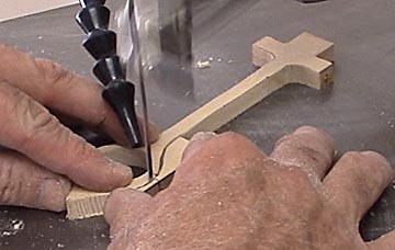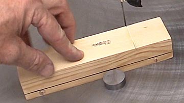 Cut the block slightly thicker than indicated by the line. You can always sand off extra wood, you can't add it back on. Band saws are to best way to do this, though this image shows me doing it with a scroll saw. The block can be cut by hand, but it requires a vice and patience. Many packs will hold a construction day where people will volunteer to bring in power saws for cutting the blocks. If you don't have a power saw this might be a good alternative.