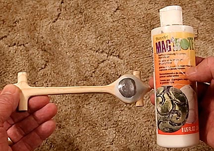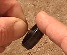 I've tested many different graphite and graphite/moly blends as well as two oil systems and none provided faster run times than Max-V-Lube graphite. (Please see AWANA GRAND PRIX RACE CARS for a detailed chronicle of these tests.) Rather than using the applicator tip supplied with it, I find I get better results by cutting a flat zone in the end of a bamboo skewer and using this to apply graphite. I start by piling graphite onto the surface of the wheel bore face and pushing up, rubbing it against the axle head. This coats both surfaces. The I add a second portion of graphite and tap the wheel to let it work its way into the wheel bore. The car is then turned over and the process repeated for the other face of the wheel. Each wheel is lubricated in this manner. (In case you were wondering, the car used for this demonstration is called the Silver Bullet. The finish is Spaz Stix Mirror Chrome spray over Testor's Model Master gloss black spray paint.)
