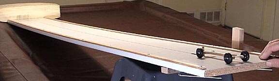 The best technique of all is to have your own track and after a rough alignment on an inclined board, fine tune the alignment on the track. Cars aligned perfectly straight on a board may still tend to run slightly left or right over the much greater length of a track. Fine adjustments on an actual track can easily trim 0.010 seconds off an already fast car. Good tracks with timers are expensive but are the most effective tools possible for producing top performing cars. And Oh yes... they're a lot of fun too. To see how to build your own track take a look at HOW TO BUILD A PINEWOOD DERBY TRACK. If you're serious about racing then you'll need a professional grade track. Try HOW TO ASSEMBLE A BESTTRACK ALUMINUM PINEWOOD DERBY TRACK for information about the best.