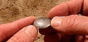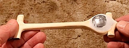 Tungsten disks average 92.5 grams, 28 grams too light for our car. The best way to provide the additional 28 grams is a one inch diameter lead dome. Making one requires melting and moulding lead, which carried with it the very real dangers of fire, burns and lead poisoning. It should only be attempted with knowledgeable, adult supervision and with the proper safety equipment. Another problem with making a lead dome is that because lead has very high surface tension, when poured into a mould it forms a meniscus that has to be ground down, which is very dangerous, or filled in with a lot of putty after it's glued onto the car. My solution was to use the end of a dowel to tamp down the lead while it was still liquid so that a flat bottom was created on the bottom of the dome.