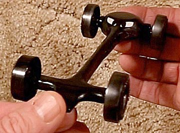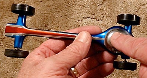 Now comes the most critical step: aligning the car's wheels so it rolls straight. Start by putting three wheels on the car, leaving one of the front wheels off. Roll it down a smooth ramp and using axle pliers rotate the axle clockwise or counter clockwise as needed to get it to roll straight. If the axle holes have been drilled straight, the natural curvature in the axles should be enough to turn the axle in or out enough to get the car to track straight. If it doesn't, it may be necessary to use an axle bender at its lowest setting to help things along. Always graphite the wheels before alignment.