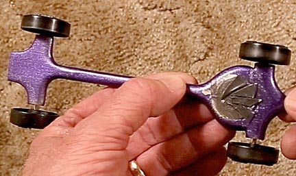 Here we have the Purple Flier (Tamia metallic glitter purple spray paint) showing trim weighs added to the bottom of the car.