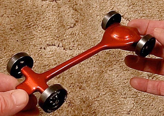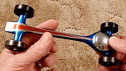 Besides locating the main weight toward the rear of the car, you also want it to be as concentrated in as small an area as possible to reduce the mass moment of inertia, or how hard the car is to turn. Consider a barbell with weights far out toward the ends. It's going to be harder to turn than one with the weights close to the center. The same applies to pinewood derby cars. If the weight is distributed all over the body, then its moment of inertia will be high and when it swerves, it will push harder against the guide rail and do so longer than a car with a concentrated weight that has a smaller moment of inertia. The best way to minimize the moment of inertia is to use a tungsten disk.