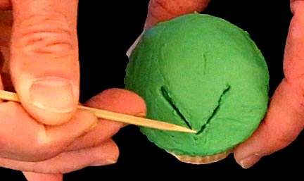 Start the smile by scoring a 60-degree "V" on the bottom half of the cupcake using the pointed end of a bamboo skewer.