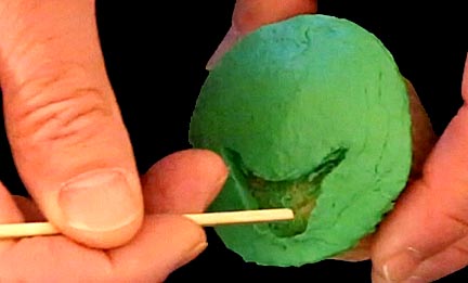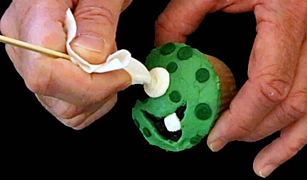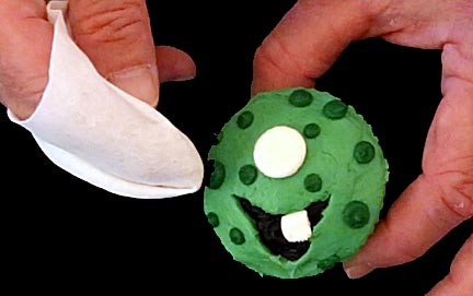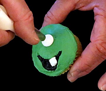 A bulging eye looks funny, but a bulging pupil looks strange. Use the bunt end of a skewer covered with paper to create a dimple to receive the black frosting that will be the pupil.