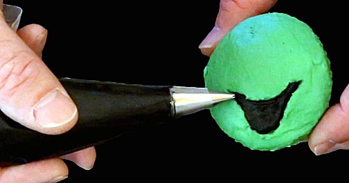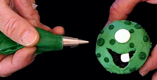 This creates a hollow which, when covered in black frosting, looks like a mouth. If the mouth is simply piped on top of the green frosting, it ends up looking like lips and doesn't work very well. Also, when the tooth is piped on top of these lips it looks like it's floating in space.