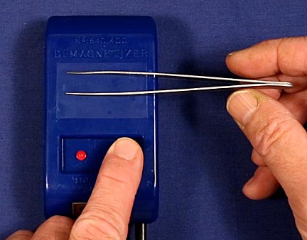 Some people claim if you bang the tweezers around, the magnetic domains that are lined up to create a magnetic field get shaken up and weaken the field. I've tried it and not had much luck. Another solution that does work is to heat the tips red hot and let them cool. The thermal agitation destroys the magnetic filed. It works, but it also takes the temper out of the tweezers so the metal becomes so soft they don't hold their shape. Fortunately there is a surefire and inexpensive solution: a demagnetizer.