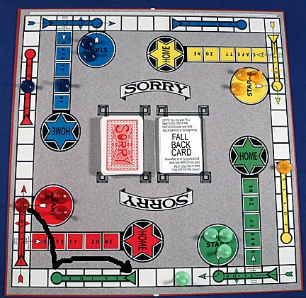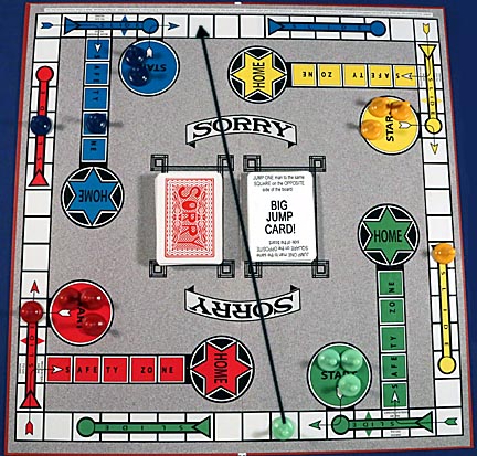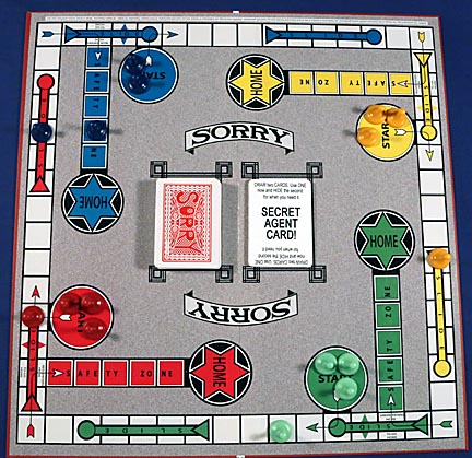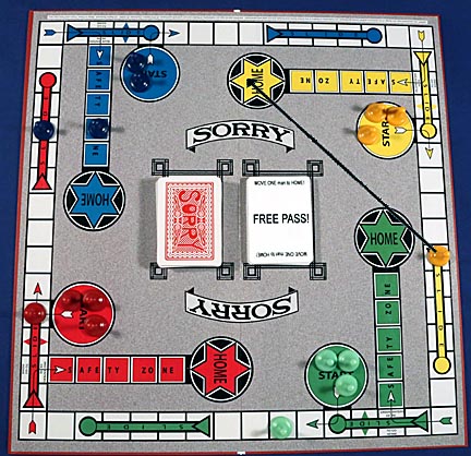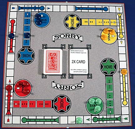 Another card that's not pictured is the UNDO card. A player drawing one of these Sorry cards puts it to the side and can play it the next time someone lay's a hit card on them. If it's used to counter a Sorry card, then this is one case where two tokens can occupy the same square. That way the player playing the Sorry card still gets their man out of Start.