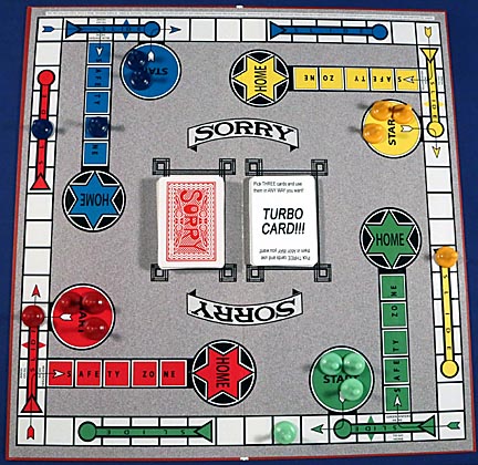I was watching my grandchildren play Sorry one day and noticed that about the only time they exhibited any animation was when they were able to nail another player with a Sorry card. The rest of the time they pretty much just ground their way through the game to its end. I got the idea that if I introduced novelty cards to the deck that caused more interaction both with the game and the other players, they might enjoy the game more. It worked!