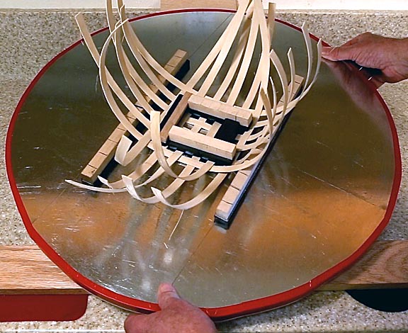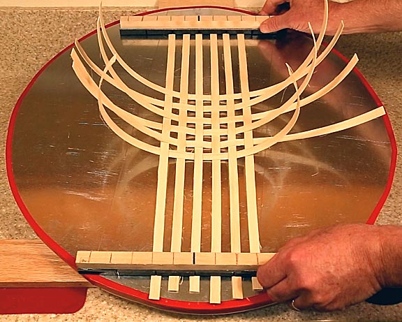 Once the center section is complete, use the smaller magnetic rods and loose magnets to secure the center, remove the long rods and use them and any remaining loose magnets to force the sides upward. This step isn't shown well in the image above because the strips weren't soaked and as a result are too stiff to bend. As the sides are being woven, rotate the platform as needed to keep the side being worked in the most convenient position.