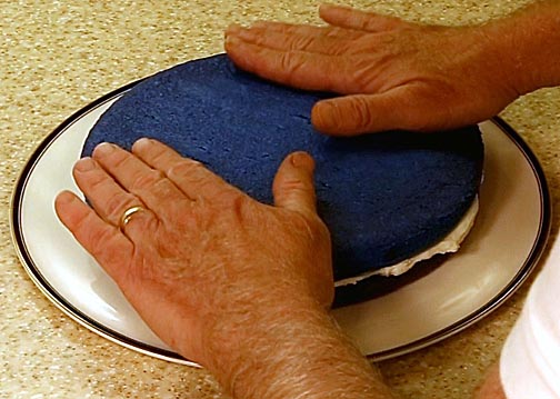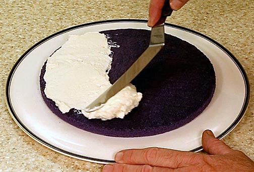 Start assembling the cake by placing the purple layer on a cake platter and covering it with a thin layer of frosting. Pushing down with an angled frosting knife helps prevent tearing the layer's surface. Level the frosting to compensate for any irregularities in the layer's surface. It's important to do this with every layer because with six layers problems tend to build up.