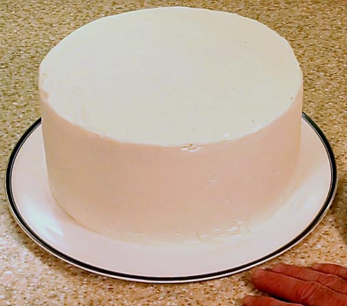 If everything has gone right, the cake should be ready for frosting. But, sometimes layers shrink more than others creating an uneven side or the layers may not have been properly centered. Either way, the side of the cake can end up too uneven to hide with frosting. If that happens, freeze the cake for a hour and use a sharp, serrated knife to trim the high spots off the sides. Place it back in the freezer for half an hour to firm it back up, dust any crumbs off the sides using a pastry brush, apply a light crumb coat of the frosting and refreeze for another half hour. Remove, apply the final layer of frosting and it should look something like the following: