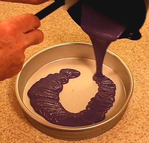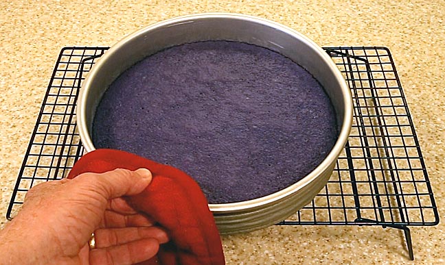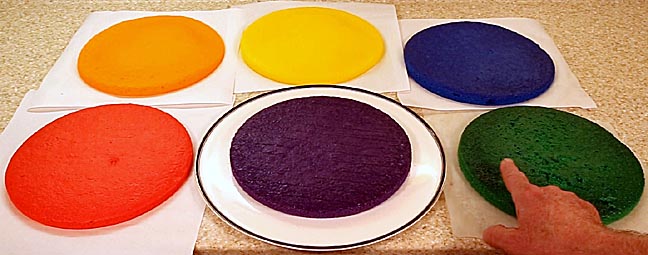 Repeat this process six times with violet food coloring (1/4-teaspoon of violet coloring results in a royal purple layer) blue, green, yellow, orange and red. I prefer baking the layers one at a time because they bake more evenly. Baking side-by-side can result in wedge-shaped layers.