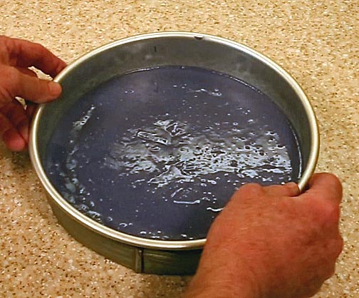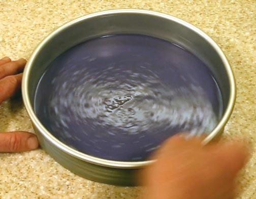 To ensure each layer is the same thickness, measuring accuracy is important. The easiest way to do this is to use a scale set to grams and weigh the ingredients into the bowl. For a ten-inch diameter pan, I found 154 grams of cake mix, which is conveniently one-third of a box, one large egg, 33 grams of Squeeze Parkay, and 92 grams of whole milk produces a layer that's a perfect three-quarters of an inch thick. Another advantage to weighing ingredients straight into the bowl is that it eliminates have to wash a lot of measuring cups. Color each layer by adding one-quarter teaspoon of gel type food coloring. I found the Wilton brand works good. Liquid food coloring doesn't have the intensity required for the brilliant, clean colors a rainbow cake should have.