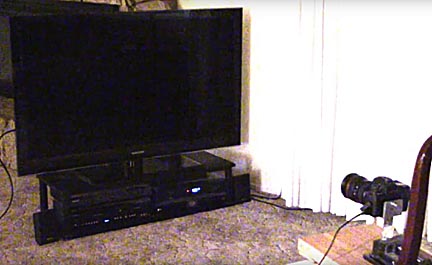 When the camera and TV are turned on, you should see something like the above. The red dot is the record light from the camera. It's on the image sent to the TV, which projects it, is picked up by the camera, sent back to the TV and so repeated. Each repetition is slightly smaller that the previous, creating the illusion it's stretching inward toward infinity.