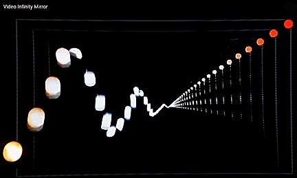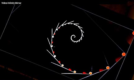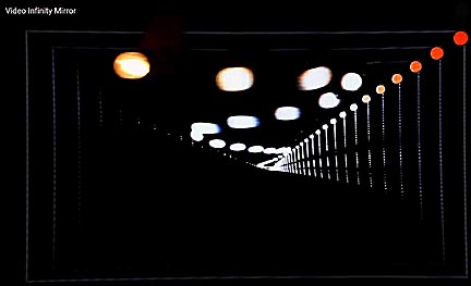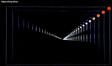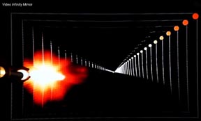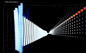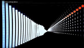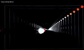 These are just a very few of the possibilities with a video infinity mirror. It's quick to set up and the range of images produced only limited by how many light sources you can think of to place between the camera and TV. A particular favorite of my grandchildren is to light their faces as they look into the camera to create hundreds of their heads fading away into the distance. Thank you for visiting this page. I hope it gave you ideas for your own video infinity mirror.