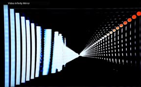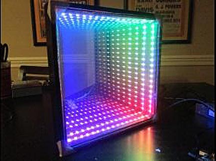 Usually lit from the edge by a string of LEDs, this creates the effect of lines of light reaching back apparently toward infinity. This web page explains how to create a similar effect using a television and video camera, with the bonus that the images can be made to come alive.