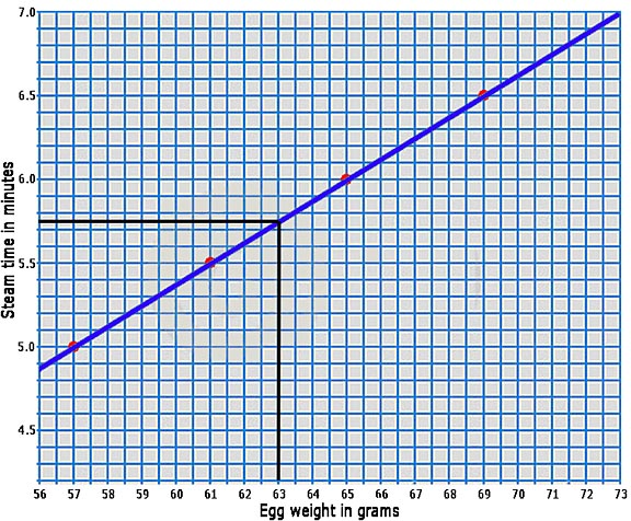 For example: Suppose you had an egg that weighed 63 grams. Starting at the 63 gram position on the bottom axis, draw a line up to where it intersects the blue diagonal line. From that point draw a line to the left until it hits the vertical axis, where it indicates a steaming time of 5.75 minutes or 5 minutes 45 seconds. Set your timer for this period, uncover the boiling pot with the napkin ring in it, place the egg on the ring...