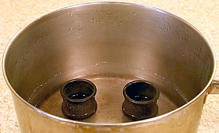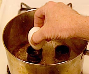 Once the water is boiling, place an egg upright on each napkin ring and quickly cover the pan.