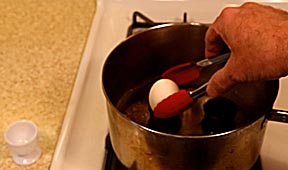 ...cover the pot and start the timer. After 5 minutes, 45 seconds, use tongs to remove the egg and place it in an egg holder.