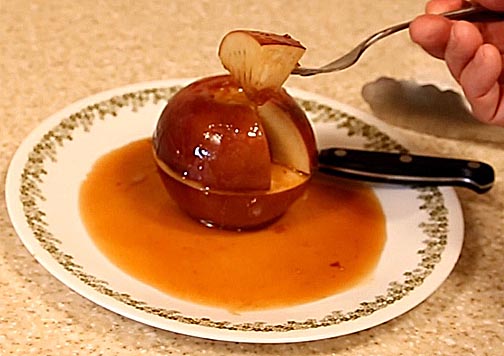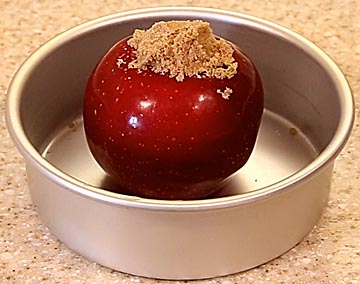 Make a syrup of 4 ounces by weight of golden brown sugar and 1/4-cup of good apple cider or juice. Add any spices desired to this syrup and heat it in a microwave until just before it starts to boil. Pour half a cup of the hot syrup into the apple.