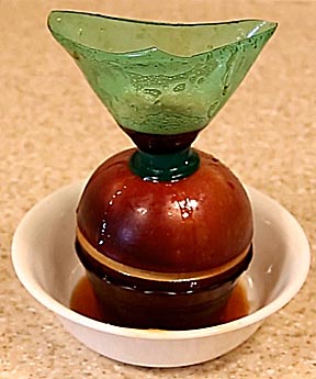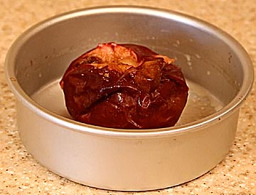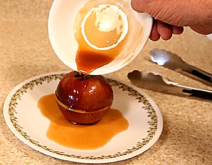 Use tongs to remove the apple and place it on a plate then pull out the funnel, being careful to avoid getting the hot syrup on your fingers. If the apple has been baked until it is very soft it may be necessary to scoop under it with a large spoon to avoid the tongs squashing it. Pour any syrup that escaped into the bowls over the baked apple. During the cooking process this syrup will have taken on a luxurious flavor and texture. Use it as a sauce to coat each piece before eating.