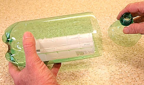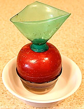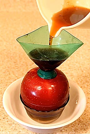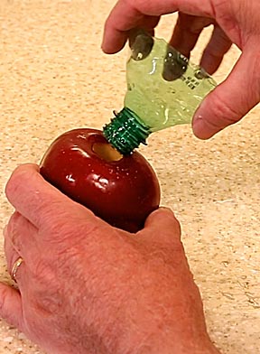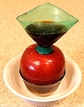 Here's where things start to get interesting. Push and screw the funnel made from the soda bottle into the apple.