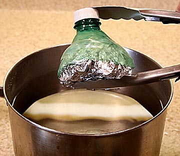 Remove the plastic ring that was originally connected to the screw cap, screw the cap back on and stuff a tight wad of aluminum foil into the funnel shaped part of the bottle top. Using tongs, hold the bottle top under boiling water for one minute.