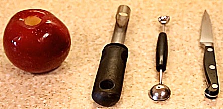 Use a 7/8-inch diameter apple corer to cut down halfway into the apple then use a small melon baller to remove the seeds. Be careful not to enlarge to core hole. It may be necessary to squash the baller's sides in slightly to do this. Don't cut down all the way through the apple. An intact bottom is required to keep the baking liquid in place. Finally, use a knife to make a very shallow cut all the way around the perimeter of the apple. All you want to do is break the skin. This allows for the apple to expand without splitting.