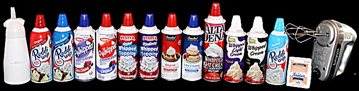 This page provides the results of taste testing 12 commercially made canned whipped creams so that anyone needing one can know which is the best. It also has tests of 3 homemade whipped creams and the final winning recipe.