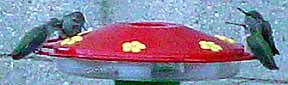 One problem with this is that night time temperatures often drop low enough to freeze the sugar water in a feeder. When the birds wake up in the morning and are in their greatest need for nectar they can't feed until the solution thaws. To prevent it from freezing I developed a simple and inexpensive warmer that keeps the nectar warm.