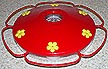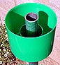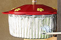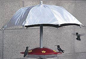 3. One day while changing the feeder I almost burned my hand on the red plastic of the top of the feeder. In the intense sun of my high desert location it had heated up to near boiling. Upon checking the feeding solution inside the feeder I discovered that it too was extremely hot to the touch. I doubt that the hummers visiting the feeder would enjoy sitting on a red-hot perch or drinking nectar that was nearly boiling. To remedy this problem I sprayed a miniature umbrella with metallic silver paint and mounted it to shade the feeder. The nectar and perches now remain cool and comfortable. As the picture below shows, the hummingbirds don't seen to mind the overhead shade: