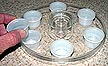 What I did was buy 250, 3/4-ounce plastic cups from a restaurant supply store for three dollars. Using indoor/outdoor double faced carpet tape I stuck six of the cups to the inside of the bottom dish right under the location of the yellow flowers used to tell hummingbirds where to feed. These cups work as holders for a second cup placed in them. After mounting it in the garden, I fill each cup with a squirt of hummingbird food and cover the feeder with the top, making sure that the hummingbird feeder holes are over the cups. Then every other day I removed the cups with any remaining solution, discard them, drop in new cups, and fill with a squirt of fresh hummingbird food. This way I eliminate almost all cleaning and am assured that the containers are absolutely sterile. The amount of wasted hummingbird food is almost zero. Instead of having to store gallons in the refrigerator I can now get by with cups.