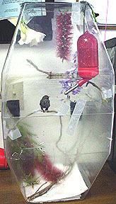 This morning, Tuesday 3/22/05, we took both feeders outside (the regular feeder, and the hamster feeder) and hung them outside. I opened the top of "Anna's" (by now, we've decided she was an Anna's Hummingbird,hence the name) aviary. She looked around a lot, but didn't seem ready to go yet, so I picked her up and placed her on a branch directly below her hamster feeder. She took a few swigs off of the feeder and began looking around. After a few minutes, she flew around a bit and landed back on the feeder. Then she flew over to one of our redwood trees and landed on one branch, then flew again, landed on another branch, did a bit of preening and did some more flying up the tree. Last we saw her before coming to work, she was sitting near the top of the tree having a bath.