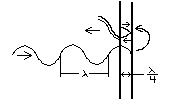 On the bottom, a light wave approaches two transparent surfaces on the right. As it hits the first surface, some of the light is reflected back toward the left (this reflection has been shifted upward slightly so it's easier to see.) This first reflected wave is the lower of the two closely spaced waves moving to the left from the first surface. Due to nature of reflections the hills and valleys of the reflected wave are flipped upsidedown relative to the incoming wave. The part of the wave that passes through the first surface hits the second and is similarly reflected. Because, in this case, the two surfaces are one-quarter of a wavelength apart, the hills and valleys of the wave reflected from the second surface will line up on top of the reflected hills and valleys from the first surface. In so doing the two reflected waves will strengthen each other and appear bright. If a different wavelength is reflected from the same surfaces, the hills and valleys from the second surface will not line up with the first wave and the reflected light will not be as bright. In fact, if the new light wave has a wavelength that's exactly half the length of the wave in the first example (so that the distance between the two surfaces now appears to it to be lambda/2) the valleys of one reflection will line up right on top of the hills of the other and they will cancel completely.