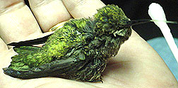 On the morning of March 18, 2005, my dog found a baby hummer lying in the parking lot (fortunately, she didn't attempt to eat it). It had already been found by the ants, who were crawling all over it. My husband noticed it was still alive and brought it inside the shop. After we got it warmed up and the ants off of it, I made up a sugar nectar (2 pts sugar/2pts water) and began feeding it by putting a q-tip in the nectar and rubbing it on her (by this time, we decided it was a little girl) beak until she began sticking out her tongue and licking the nectar off of the q-tip on her own.
