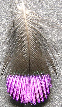 The iridescent portions of hummingbird feathers contain millions of tiny transparent air-filled cells. The fronts and backs of these cells provide the two surfaces needed to create the interference reflections that selectively reflect some colors stronger than others. These cells are stacked many layers deep and each layer helps purify the light to a single color. The following close-up is of a feather from an Annas hummingbird (found in a hummingbird nest - I have no idea how it got there since I assume it's the females that build nests.)