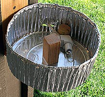 I mounted a deep aluminum pan on the feeder's support platform and secured a block of wood to the center to hold the feeder. Then I placed a 4-watt night light inside it and plugged the light into a automatic timer. The foil pan helps hold in the heat and light from the bulb and concentrate it on the feeder.