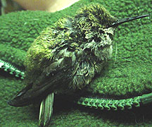 We live in a rural area in southeast Tennessee and maintain hummingbird feeders on the front porch for the entertainment value. Summer of 2000, after a bad storm, we discovered what we thought was a dead hummingbird in the yard. Much to our surprise, it moved a bit when we picked it up. We sat it back down to see if it would fly away, but after a half hour the best it could do was sit up and wobble a bit before falling over again. We decided to rescue it. Because of the small size, we assumed (probably incorrectly) that this was a youngling who had lost its mother before it was old enough to fly.