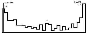 The numbers on the chart indicate the total number of visits during the half-hour bar they are closest to. The most active times are 15 minutes before and after sunrise and sunset. In the early morning the birds are more likely to sit for long periods of time to soak up nectar to replace energy lost during the long night. In the evening they are more prone to fight others away and tend to make shorter stops.