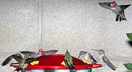 While there are hummingbird sanctuaries where over time and with an overabundance of human supplied nectar hummingbirds' natural territoriality breaks down and they learn to accept the presence of other hummers, this is the exception to the norm. In most areas a feeder will be dominated by a single bird with occasionally one other hummer moving in to steal a drink from time to time. Although many of my neighbors maintain feeders, for some reason the local hummingbirds seem to prefer mine, as the following photograph shows: